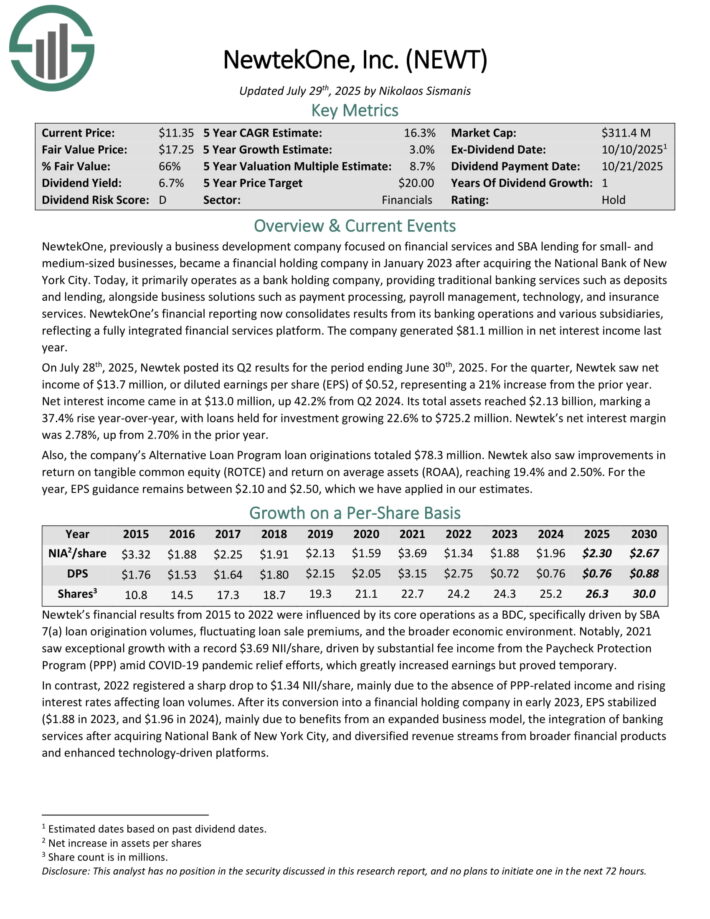 On July twenty eighth, 2025, Newtek posted its Q2 outcomes for the interval ending June thirtieth, 2025. For the quarter, Newtek noticed internet earnings of $13.7 million, or diluted earnings per share (EPS) of $0.52, representing a 21% improve from the prior 12 months.